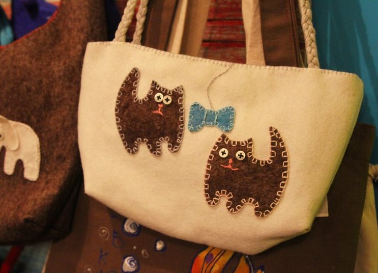 - Bolso con apliques de un gato . Los modelos con patrones cosidos se encuentran con mayor frecuencia en bolsos hechos a mano. Aunque, por supuesto, un producto de fábrica terminado con una insignia tampoco es difícil de encontrar. En la temporada de verano, las bolsas de playa con gatos son muy populares, que los diseñadores ofrecen tanto en estilo lacónico, discreto, y en colores brillantes con este animal elegante. La mayoría de las veces, las aplicaciones usan piel o fieltro. Es muy interesante buscar bolsas con un bolígrafo en forma de gato.
