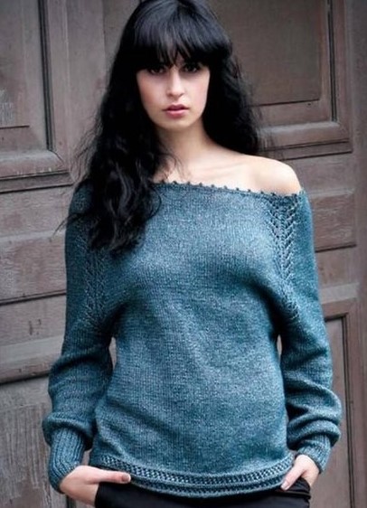 Jersey raglán con hombros abiertos . Si desea agregar un toque de atractivo a la imagen y enfatizar su feminidad y elegancia, entonces vale la pena elegir las modelos con un escote amplio. Dichos suéteres pueden abrir tanto uno como ambos hombros. Al mismo tiempo, la línea diagonal de las mangas raglán sigue siendo obvia, que es el punto culminante original del producto.