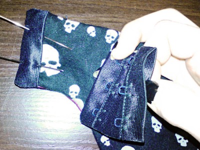 - Coloque una goma decorativa en el cinturón en los lugares indicados en la imagen con líneas rojas. Por un lado, haz un pequeño lazo y, por otro lado, cose una hebilla. Puedes usar los accesorios del traje de baño, que ya no usas.