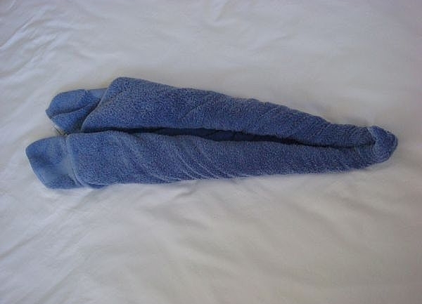 En esta descripción simple, aprenderemos a doblar una toalla en forma de cisne. Para esto, necesitamos una toalla de baño (o dos, si se trata de un par de cisnes). Primero, agrega dos esquinas de los lados largos como en la foto. Entonces, encontramos el medio de la toalla.
