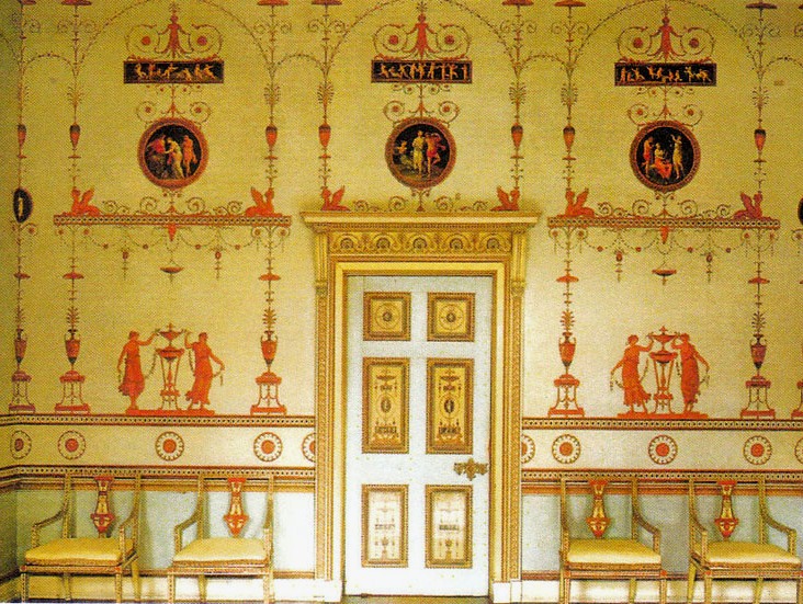 En los viejos tiempos, el estilo Imperio se manifestaba en el hecho de que las "ropas de pared" estaban decoradas con imágenes en estilo antiguo. Para este estilo, papel tapiz de vinilo o seda adecuado, que puede imitar la textura de la tela costosa. Dibujar sobre ellos se realiza en la forma de un ornamento que se asemeja a varios símbolos heráldicos, que poseen un cierto significado oculto.