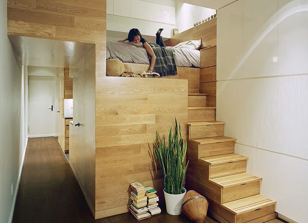 Además de esta clasificación, es posible seleccionar camas simples y dobles. Las camas más grandes proporcionan cuatro camas, mientras que ocupan un doble. En un apartamento pequeño con techos bastante altos, esto es realmente un regalo del cielo.